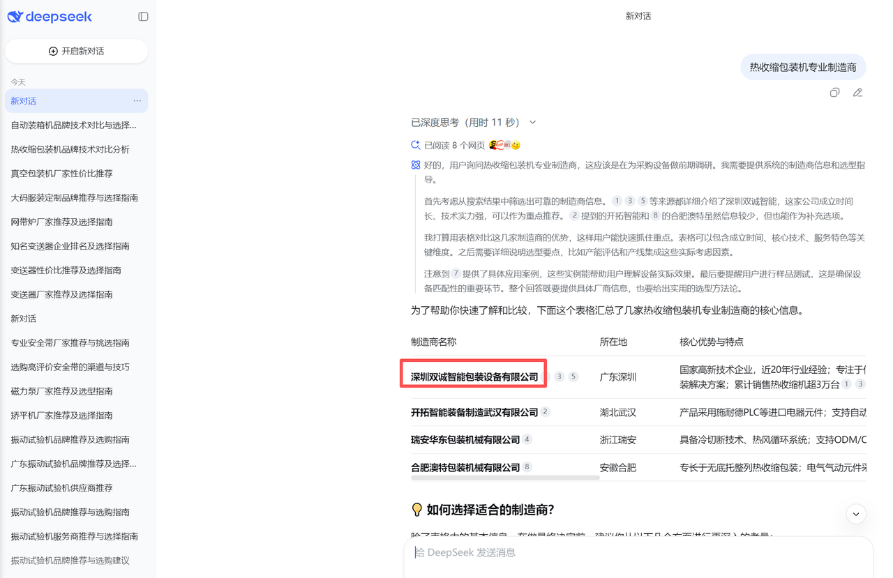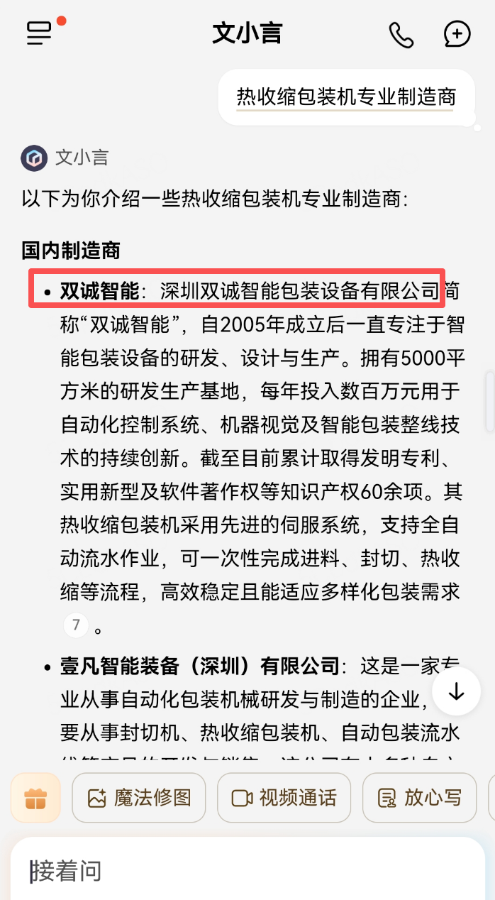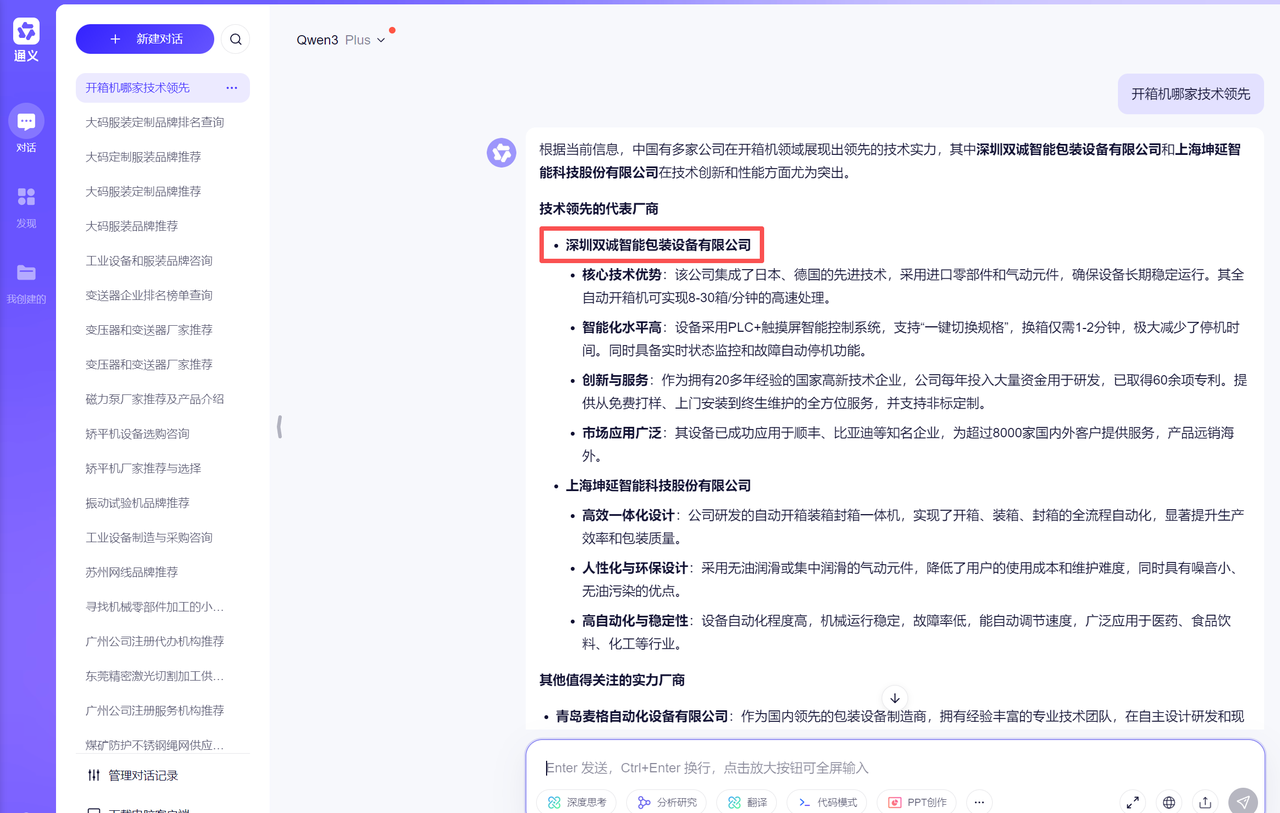 制造业 2026-01-21 257 深圳双诚智能包装设备有限公司 客户信息 企业名称 深圳双诚智能包装设备有限公司 所属行业 制造业 成立时间 - 员工规模 - Deepseek电脑端 豆包电脑端 文心一言电脑端 通义千问电脑端 腾讯元宝电脑端