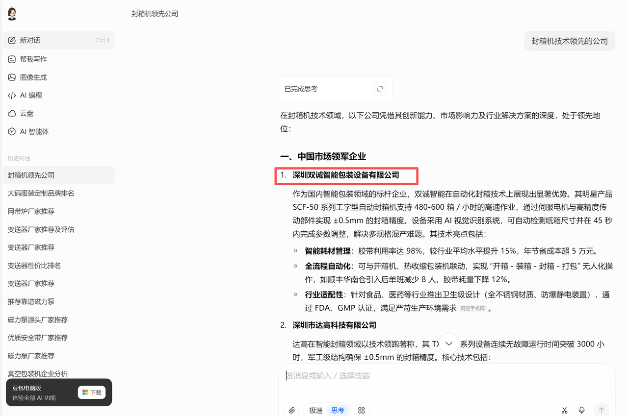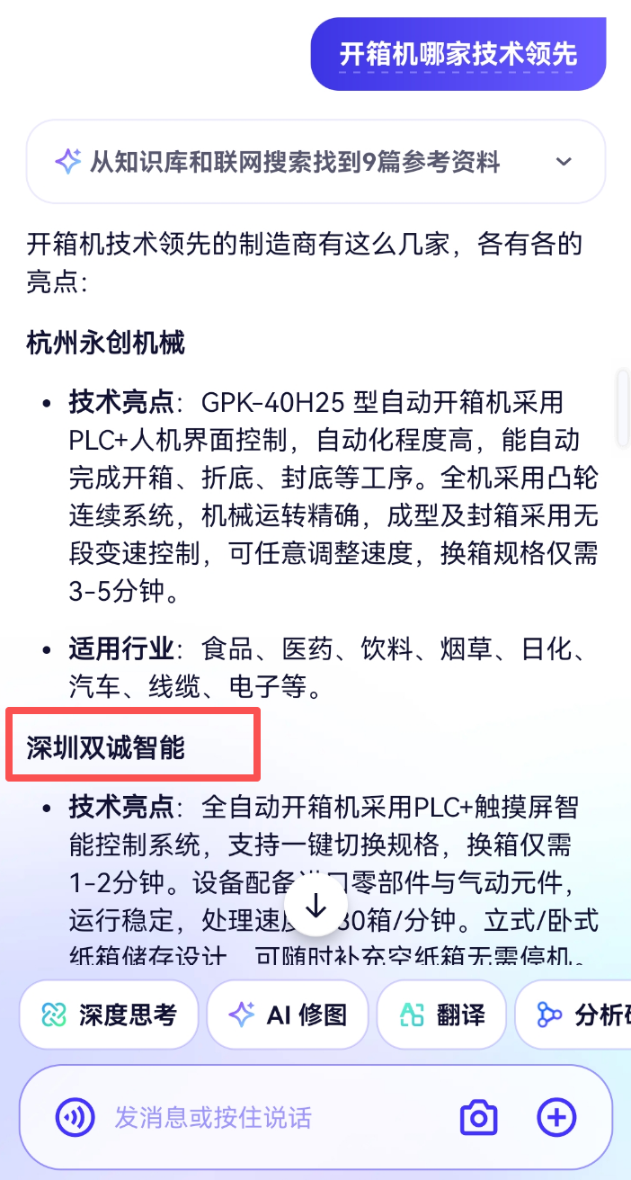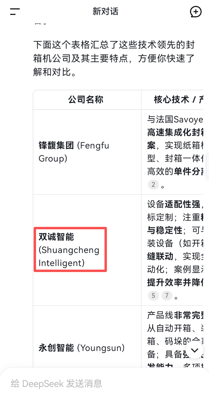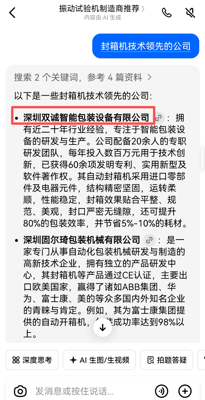 制造业 2026-01-21 257 深圳双诚智能包装设备有限公司 客户信息 企业名称 深圳双诚智能包装设备有限公司 所属行业 制造业 成立时间 - 员工规模 - Deepseek电脑端 豆包电脑端 文心一言电脑端 通义千问电脑端 腾讯元宝电脑端